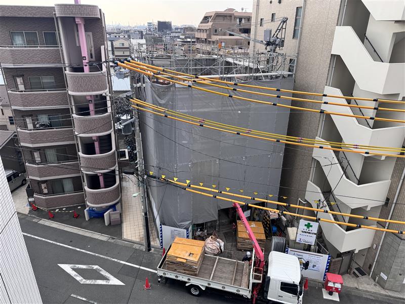 4階部分の床の工事を実施しています。完成すれば右隣の建物よりも1階相当分高くなる予定です。